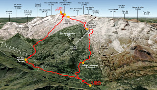 Segundo día de vacaciones por las tierras del Valle de Benasque, y segunda aventura que La Compaía de La P.E.. realizará por tierras oscenses: la ascensión del Aneto (3.404 mts), el rey geológico de los Pirineos. Ana, Chema y Jose con raquetas de nieve, y Chus y David con esquís de montaña se lanzarán a la conquista de esta cima que forma parte de El Reto de… LOS 3000’s DEL PIRINEO. La vía de ascensión escogida para la aventura es la ruta clásica que parte desde la Besurta pasando por el refugio de la Renclusa y cruzando la Cresta de los Portillones por la brecha del Portillón Superior en dirección al Glaciar del Aneto. El descenso será directo por el glaciar hasta el Plan d’Aigualluts desde donde llegarán al punto de partida en el parking de la Besurta. Aprovecharán la ascensión para coronar también la cima del Punta Oliveras-Arenas (3.298 mts), un tresmil secundario que se encuentra junto al gigante pirenáico. Y todo ello en una sola jornada de montaña que promete ser dura y larga. Muy, muy larga...